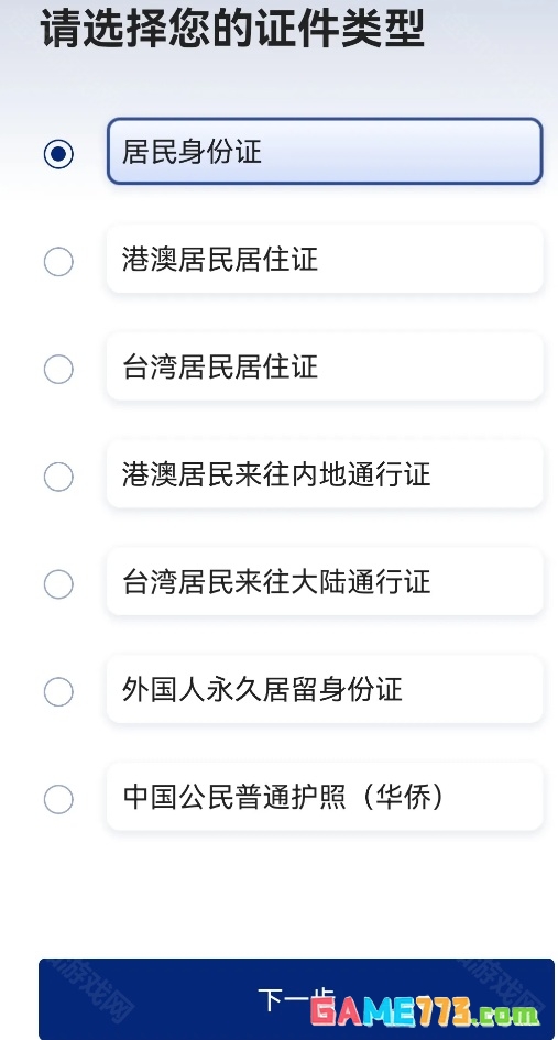 2、在新的页面中,根据我们的个人情况选择【证件类型】(居民身份证、港澳台通行证等),然后点击下方的【下一步】