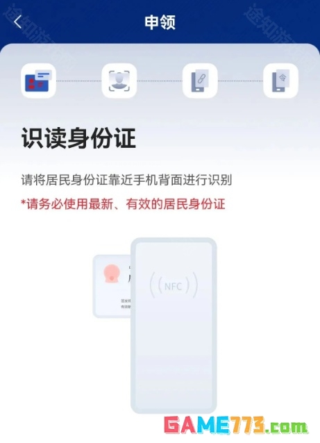 3、进入【申领】页面,需要我们把证件放置在手机的NFC感应区,放置完成后即可自动读取我们的身份信息
