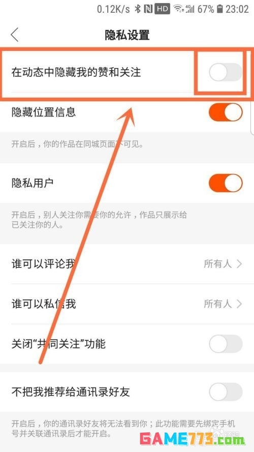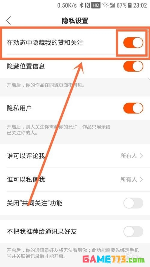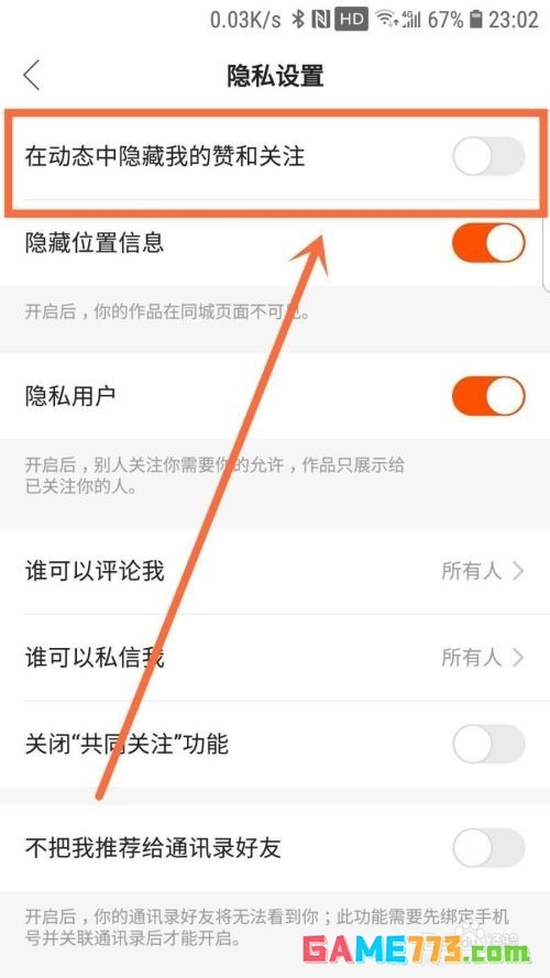 进入隐私设置界面后,找到在动态中隐藏我的赞和关注。如下图所示