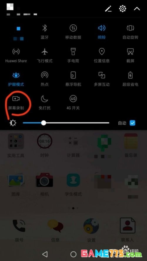 2、之后会看到状态栏,如图,屏幕录制键就在我画红圈的位置。