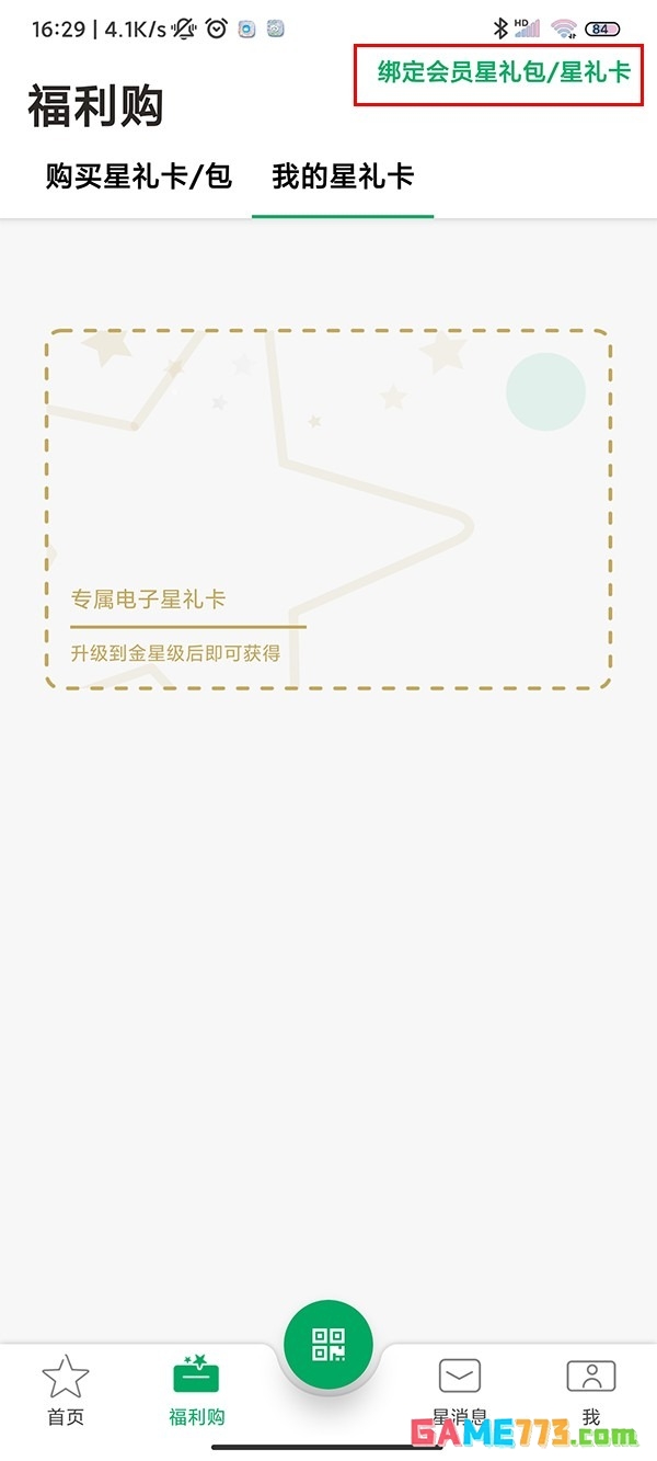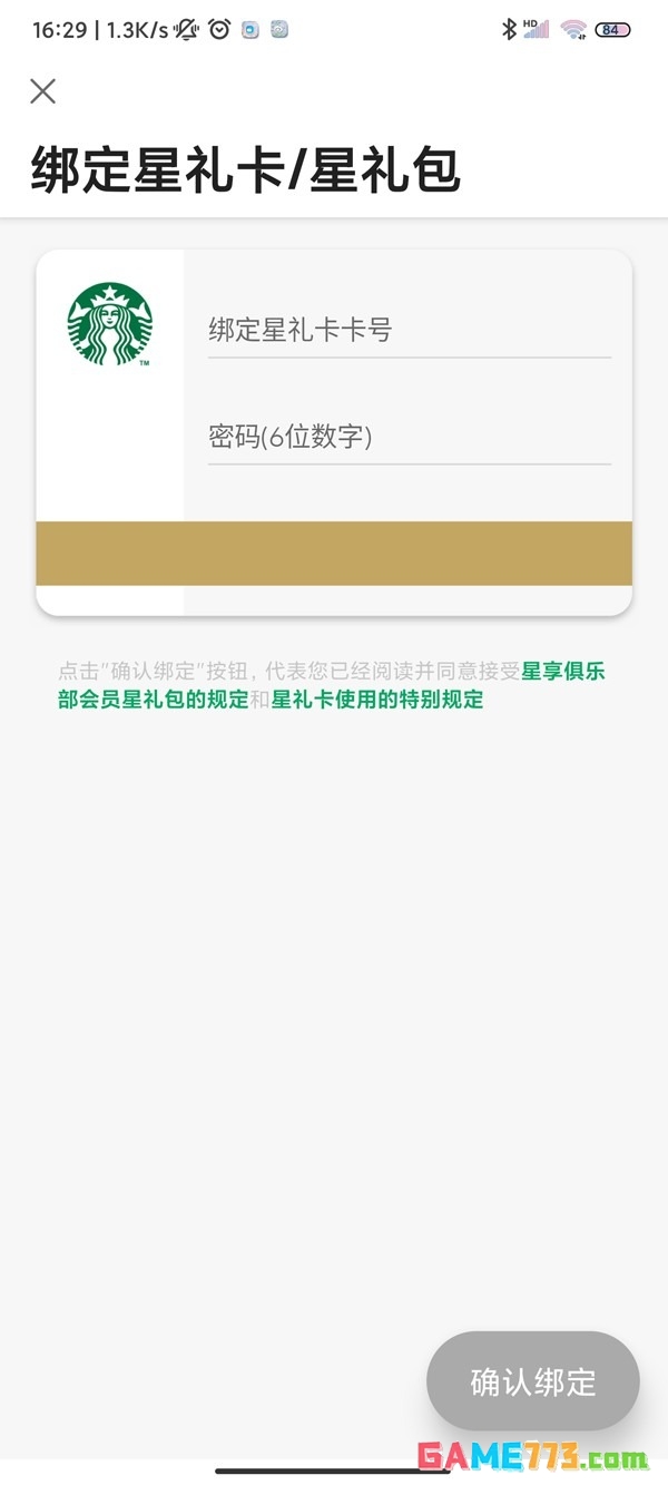 1、在星巴克福利购页面,选择个人星礼卡,点击绑定星礼卡并输入星礼卡信息。