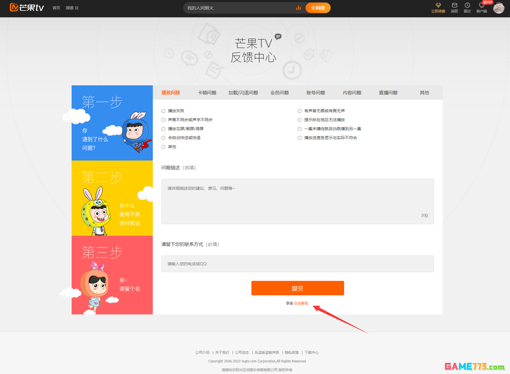 芒果TV网页版联系在线客服:页面侧边【反馈】按钮-选择【问题反馈】-进入【反馈中心】-找到当前页面底部【在线客服】入口-在【在线客服机器人】对话窗口点击【联系人工客服】。