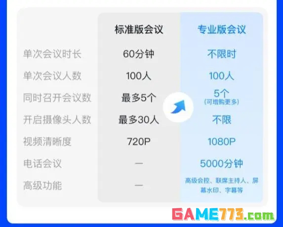 基础功能方面,钉钉会议标准版与专业版均可同时召开最多 5 个会议,专属版可召开最多 10 个会议;标准版可最多开启 30 个摄像头,专业版与专属版不限数量;标准版视频清晰度为最高 720P,专业版与专属版为最高 1080P。