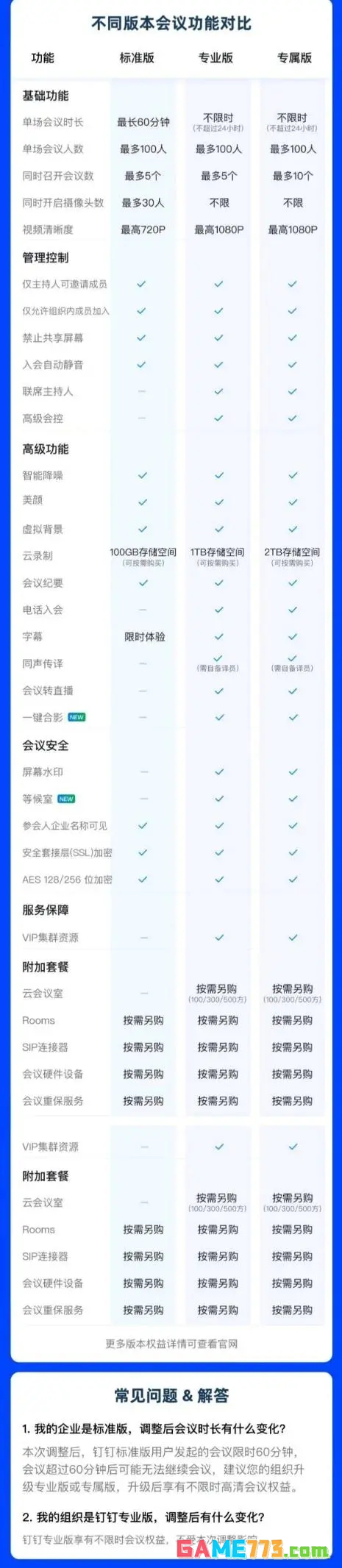公告显示,2023 年 2 月,钉钉发布《钉钉会议功能权益调整》公告,对标准版免费用户开放了多项高级功能限时免费使用。2023 年 8 月 1 日起,100 人不限时会议权益逐步结束限免,单场会议时长从 45 分钟提高为 60 分钟,单场会议人数上限从 25 人提高为 100 人。
