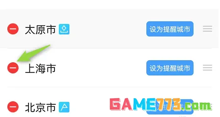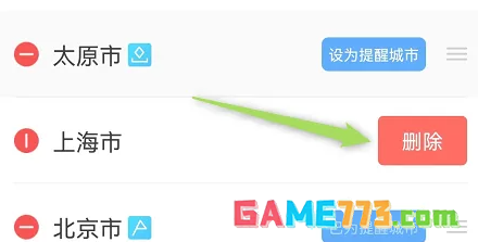 添加的城市都会出现在首页面,我们只需左右滑动就能切换,如果有一些城市以后不会用到了,那么再次点击左上角“+”号,接着长按需要删除的城市名,这样每个城市前面都会有一个红色符合,单击此符号即可看到“删除”选项;