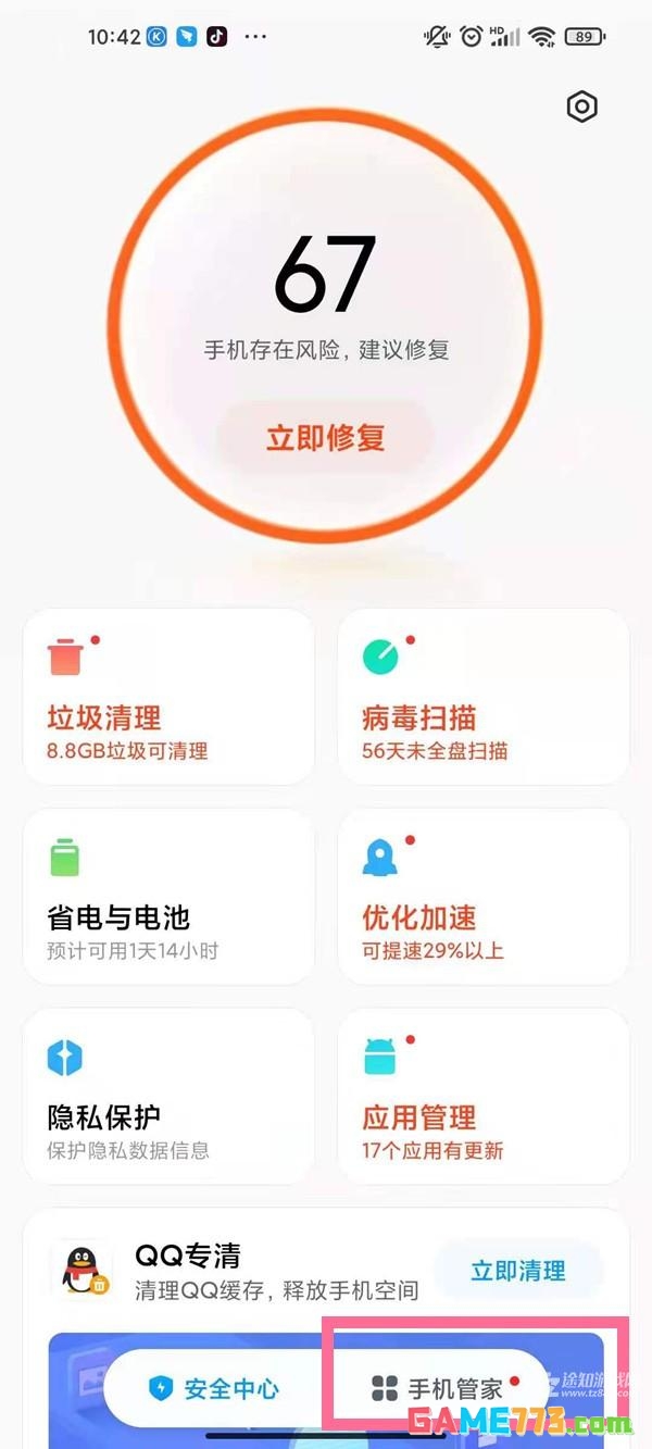 1、打开手机管家app,点击下方的手机管家菜单图标。