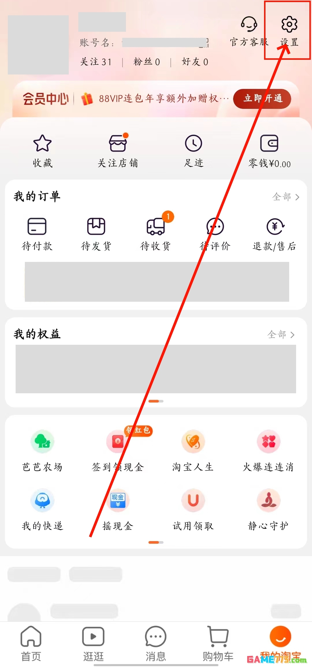 1、打开淘宝,在我的淘宝页面点击【设置】图标。