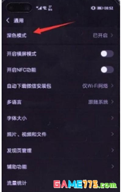 在通用设置的功能页面中,我们可以看到一个深色模式,点击并打开深色模式,之后微信整体的背景就会变成黑色,字体变成白色,比较适合夜间使用。