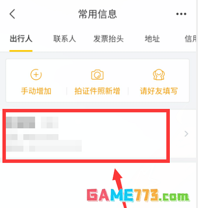 第三步:进入常用信息页面后我们可以找到自己的乘机人信息了,这时候长按个人信息。