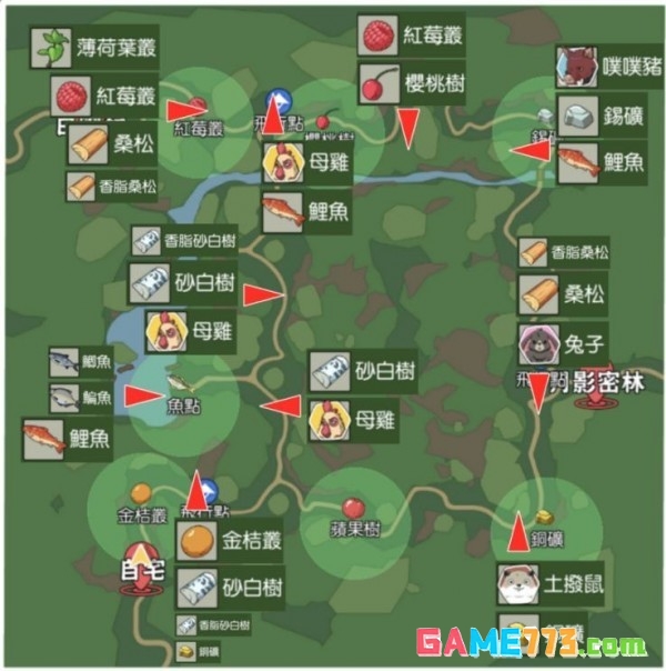 鲤鱼目前只可以在朝晖森林钓到。朝晖森林的钓鱼点分布在河流的首尾,和中间部位,具体位置如下图所示。