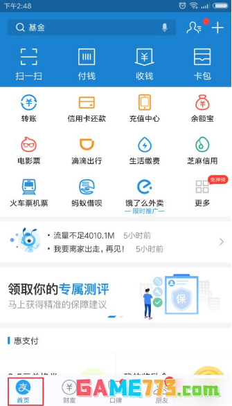 打开手机中的支付宝,点击下方的“首页”选项。