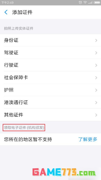 下拉至下方,找到“证件”功能并点击。