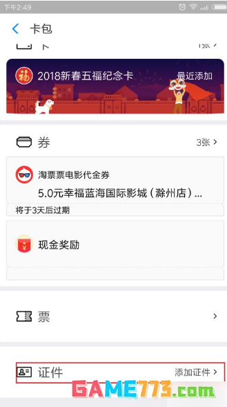 在首页界面中点击上方的“卡包”。