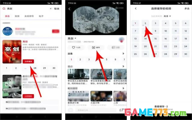 2、打开搜索结果页面点击“立即播放”,然后点击“缓存”,接着点击“集数”,即可进行缓存。