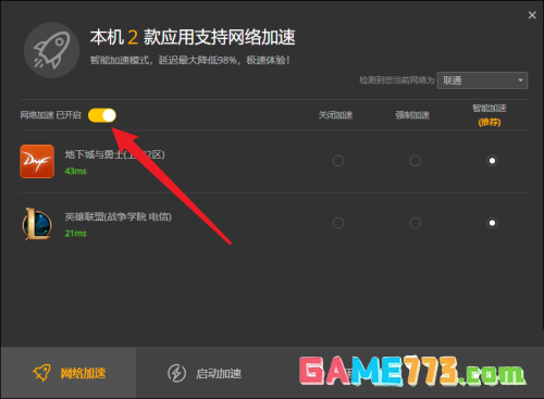 4、最后在辅助工具设置界面中,点击开启【网络加速】功能即可。