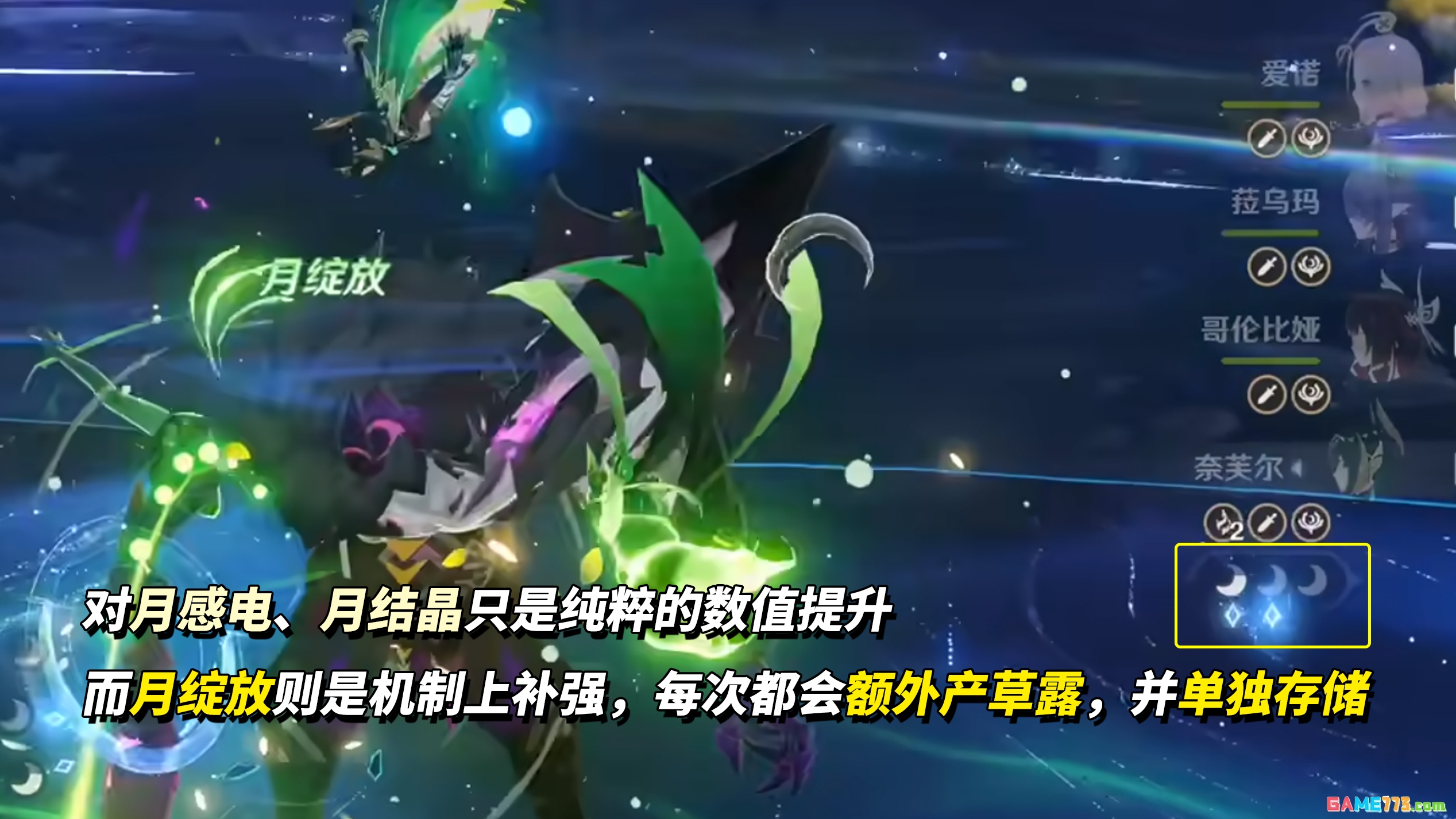 在此期间队伍触发月曜反应会积攒引力值(角色背后月亮光环会显示当前积攒情况),满额后触发1次协同攻击。攻击类型取决于引力值贡献最高的月曜反应,若为月感电、月结晶则是单次伤害,若为月绽放则造成5次伤害。
