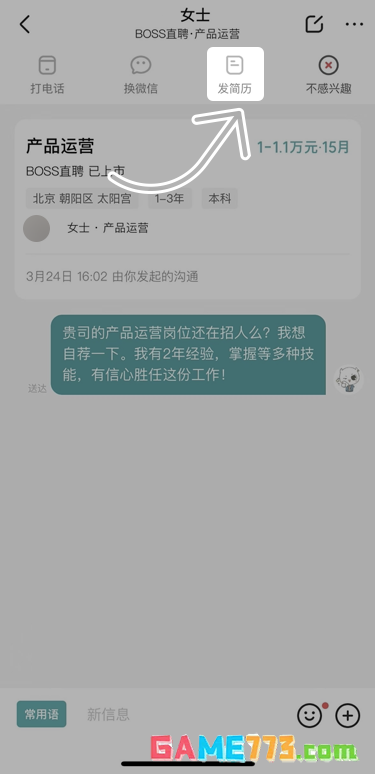双方回复后,点击顶部的【发简历】,发送简历/作品集。