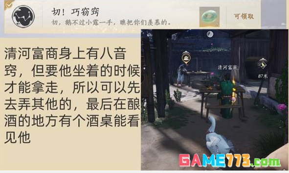 清河富商身上有八音窍,但要他坐着的时候才能拿走,所以可以先去弄其他的,最后在酿酒的地方有个酒桌能看见他