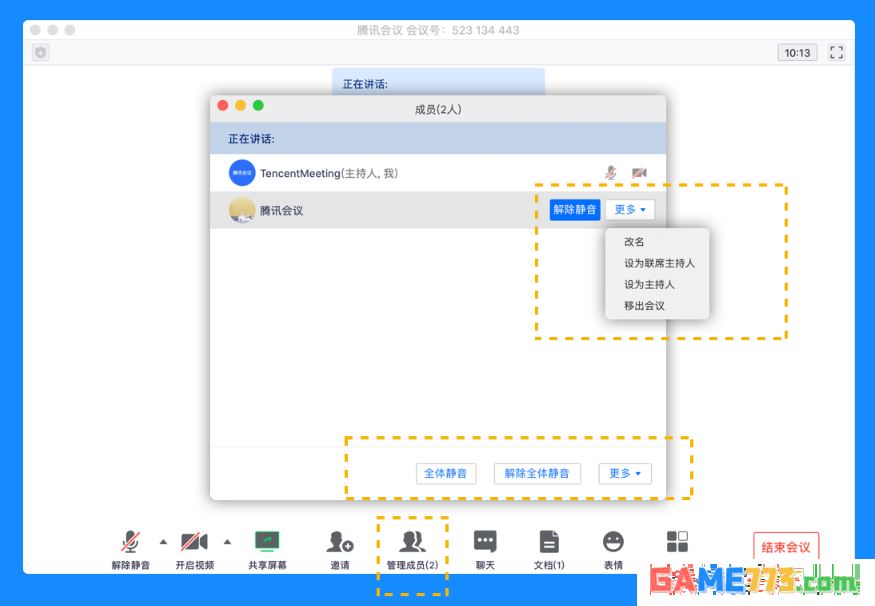 ①移出会议成员(可设置成员被移出后将永久不得加入此次会议);