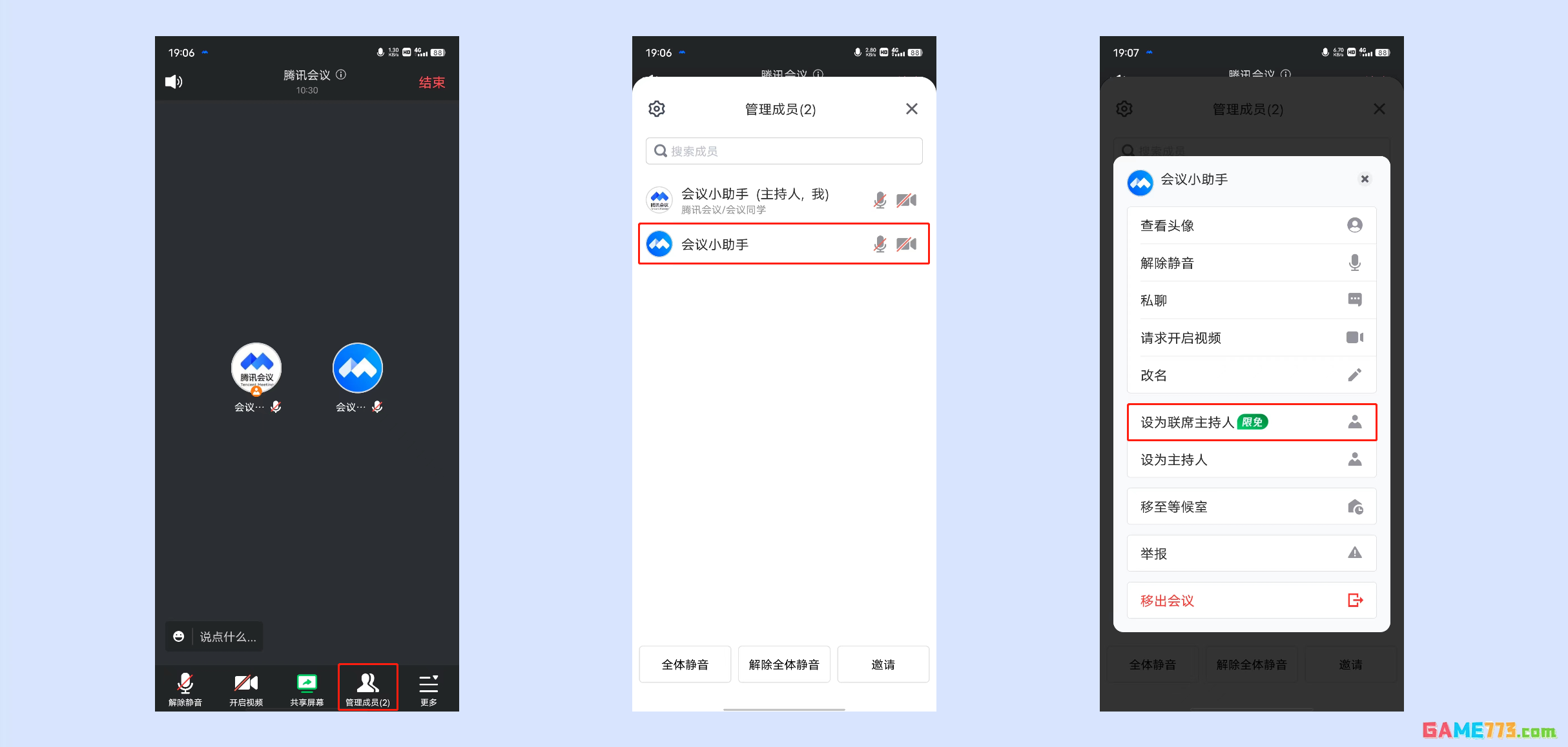 ①主持人会中点击【成员管理】->选择成员->【更多】->【设为联席主持人】即可;