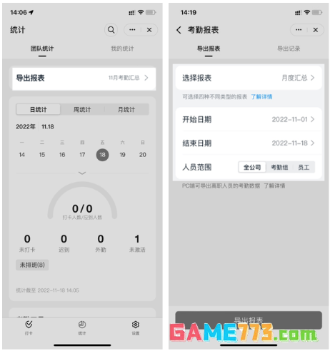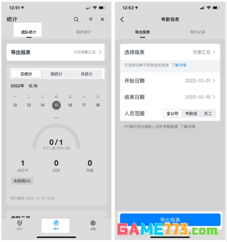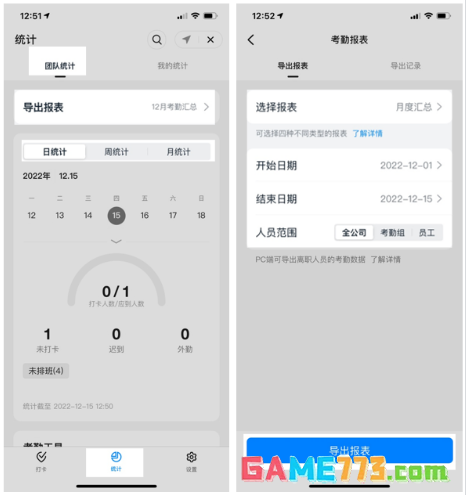 手机端钉钉>工作台>考勤打卡>统计>团队统计>选择日统计/周统计/月统计查看,或点击上方导出报表>选择日期、报表类型和人员范围>导出报表,导出的报表会通过工作通知发送。