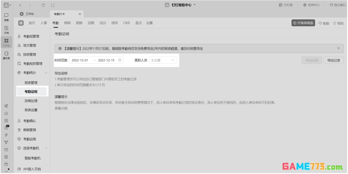电脑端钉钉>工作台>考勤打卡>考勤统计>考勤证明,选择考勤时间和对应的离职人员。