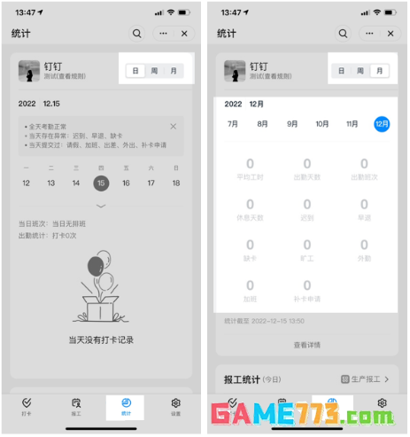 手机端钉钉>工作台>考勤打卡>统计,可以按照按日/周/月来查看6个月内的考勤数据;不支持员工自己导出6个月内的考勤数据,若需要导出可联系管理员、考勤负责人、部门主管。