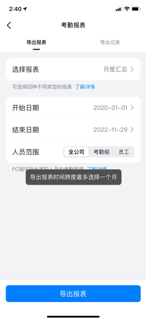 答:因为单次最多只能查看显示一个月数据,如果您需要导出半年的数据,需要您分6次查看半年的考勤数据,导出之后汇总即可。