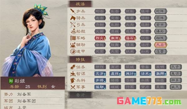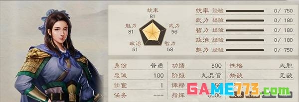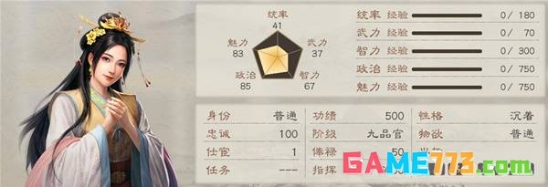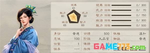 智力型老婆,自带1级天启很有用,83智搭配上全2级的智谋栏用来搞计谋破坏是可以的。
