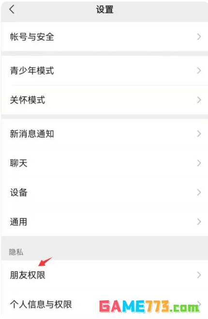 2、进入【设置】,找到【隐私】,点击【朋友权限】。