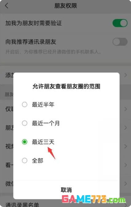 4、勾选【最近三天】,即可设置微信朋友圈只显示三天。