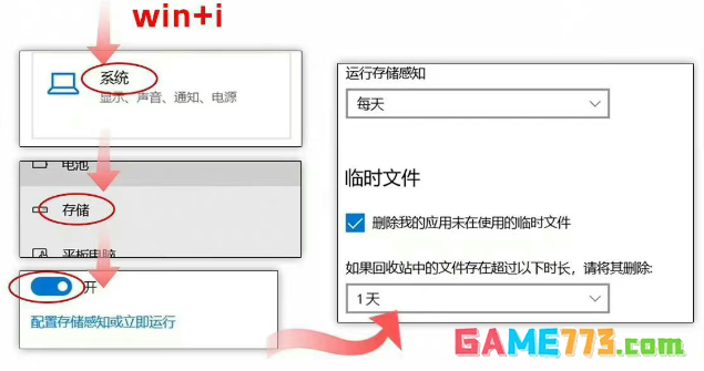 win+i打开设置-系统-储存-上面打开存储感知——分别设为每天和一天