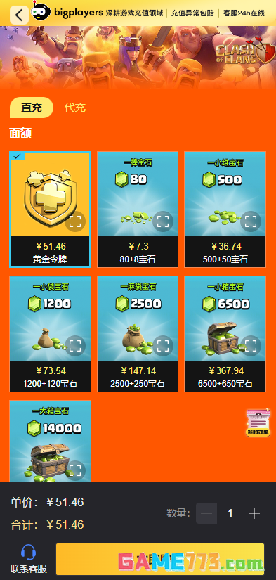 1、点击上面链接,进入部落冲突国际服指定代充网页,选择想要充值的面额以及数量之后,点击立即购买;