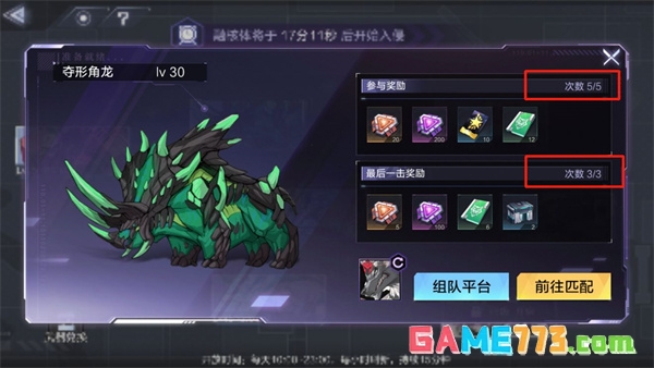 在融核体存在的时间内,参与挑战次数不限,其中参与奖可以领取五次,最后一击的奖励可以领取三次。(队伍中任何一名成员拿到了最后一击,全队都可以获得最后一击的奖励)