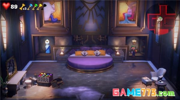 第四间房间是画室,去右边打开机关,地板会变成一个天平,我们要上去关闭机关得到紫宝石钥匙。