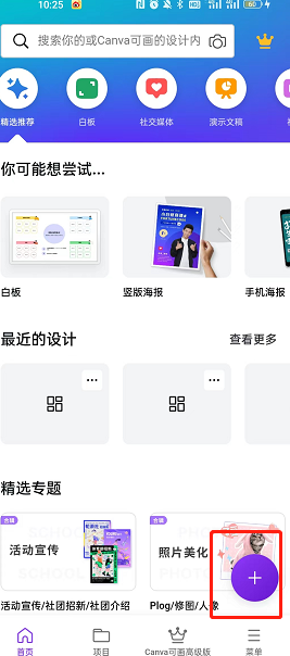 第一步:打开canva可画后,我们点击界面中的【+】,就能进入到选择的界面,如图所示: