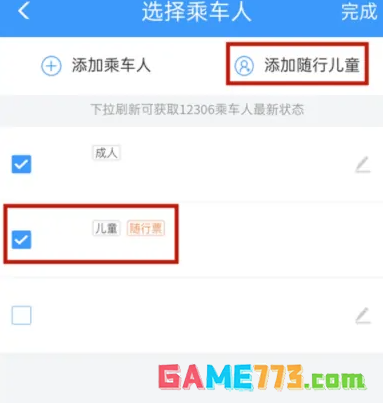 2、点击添加随行儿童后会自动添加随行票,再点击完成。