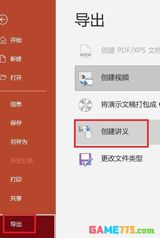 打开PPT后单击左上角“文件”选项卡中的“导出”,接着再选择右侧出现的“创建讲义”根据提示操作。