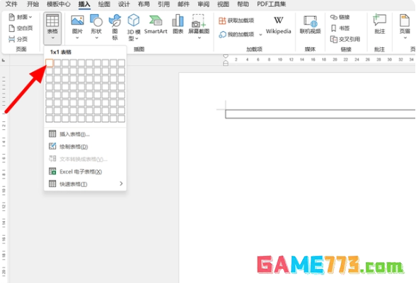 在菜单栏的插入选项下,点击【表格】,选中插入【1×1】(一行一列)。
