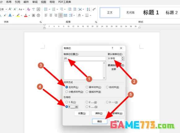 接着根据实际需要设置制表位位置、默认制表位、对齐方式,引导符选择4.单击【确定】。
