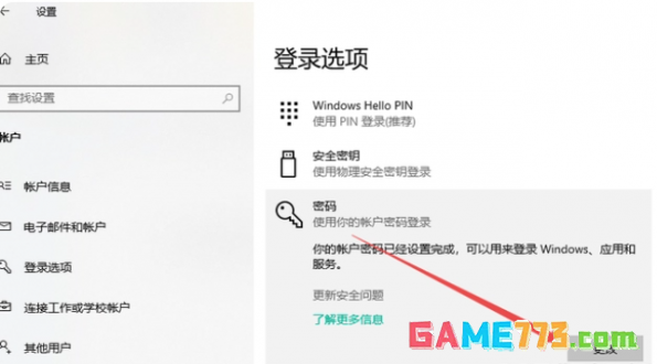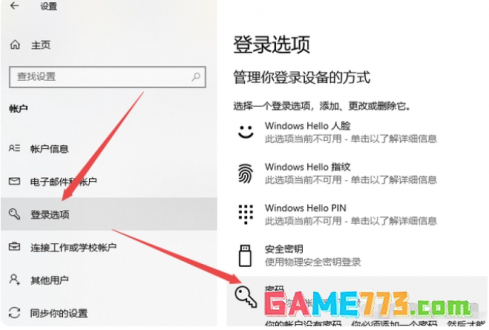 2、点击左侧“登录选项”,然后在登录选项下点击“密码”进入。