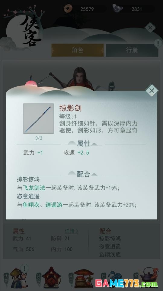 9.掠影剑:搭配飞龙剑法、鱼翔衣、逍遥游,触发武力1、攻速2.5.价格369.