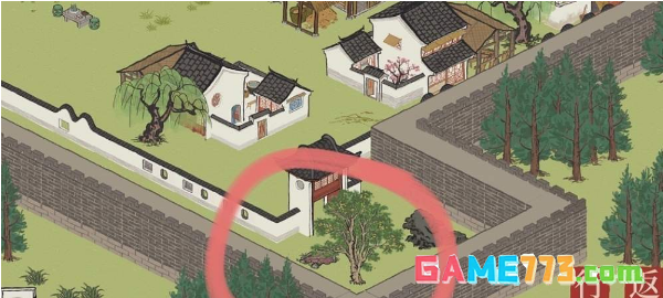 3、地图角落处,有一棵树和一款石头为参照物的围墙大门口。