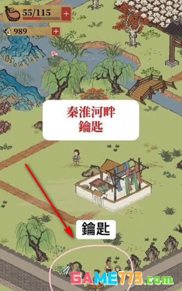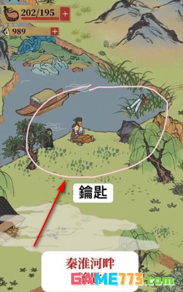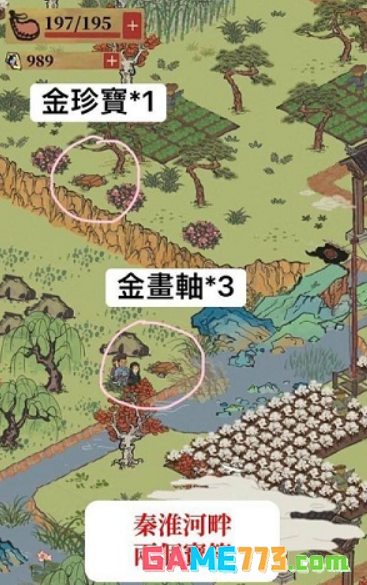 1、秦淮河畔有两个宝箱,分别在图中的两个地方,金珍宝和金画轴,各需要10体力搬动宝箱