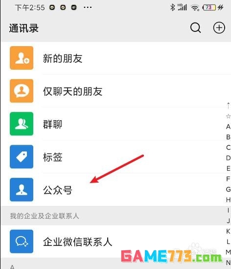 2、打开微信通讯录页面之后打开公众号选项;