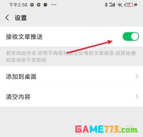 6、打开设置页面之后点击第一个选项将接受文章推送的开关关闭即可。