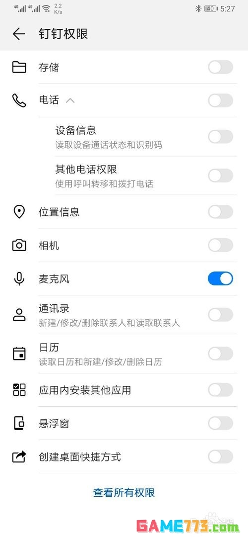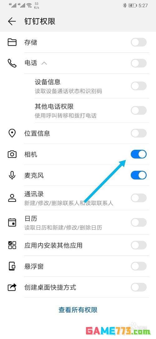 此时,点击进入后,我们可以看到钉钉的相机权限是打开的,点击即可,如下图所示。