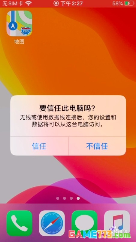 用苹果原装数据线连接手机,此时手机会提示是否信任该电脑的选项,点击信任。