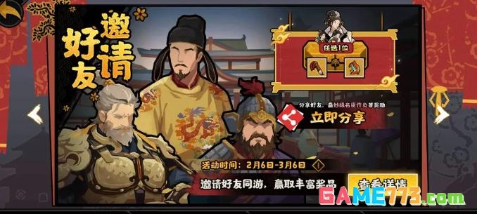 上线全新社交激励机制,成功邀请指定数量新玩家注册并达成活跃条件后,可领取妙级名臣自选宝箱,内含许负、许慎、桓伊、伯牙、子期五位功能型名臣,覆盖占卜、典籍、音律、外交等多元领域,有效缓解新手期阵容成型压力。