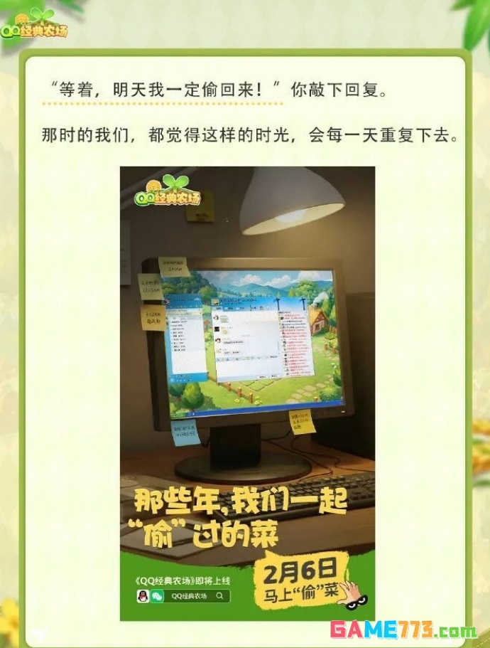 2月6日,《QQ经典农场》正式回归,不管你是想重温当年的快乐,还是想看看爸妈辈口中的“全民游戏”到底有多上头,都可以来试试。约上当年一起偷菜的好友,重新开垦属于我们的农场,再偷一次菜,再“捣乱”一次,把当年没玩够的快乐,全部补回来。